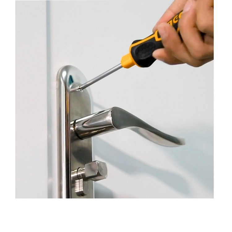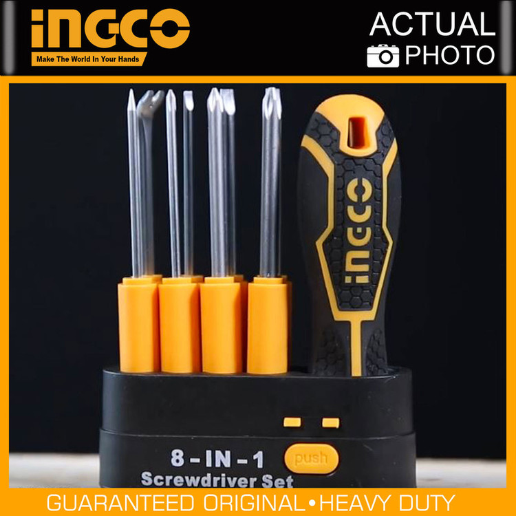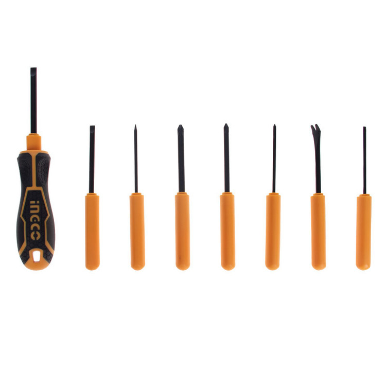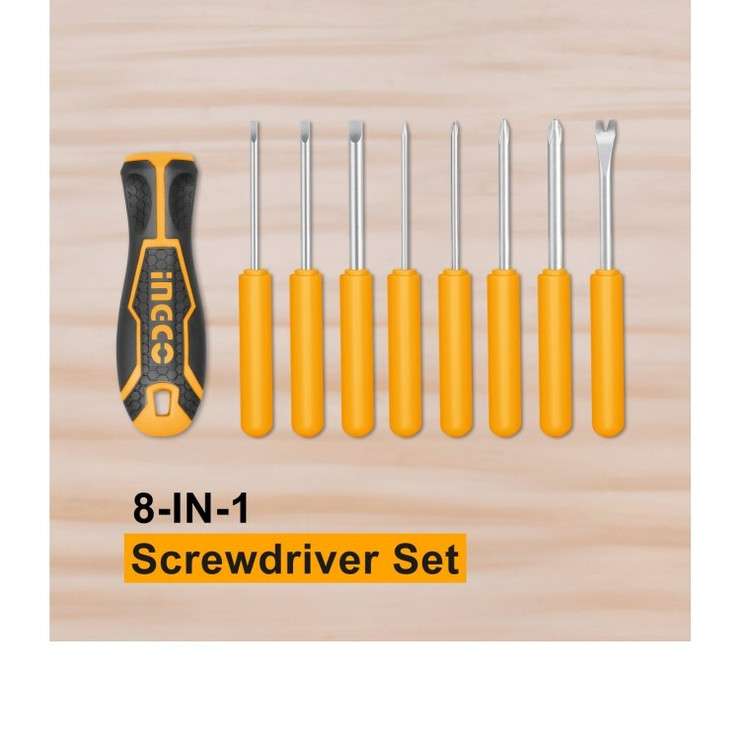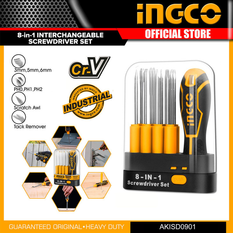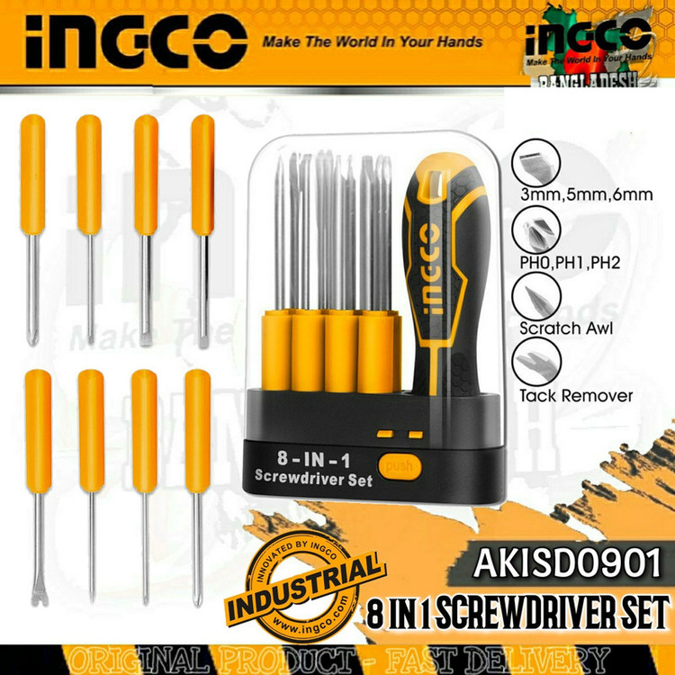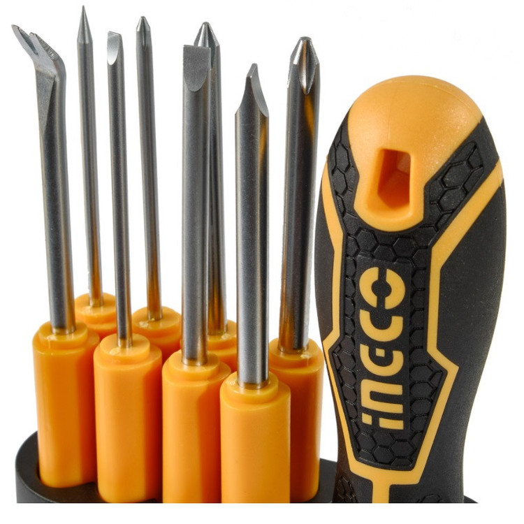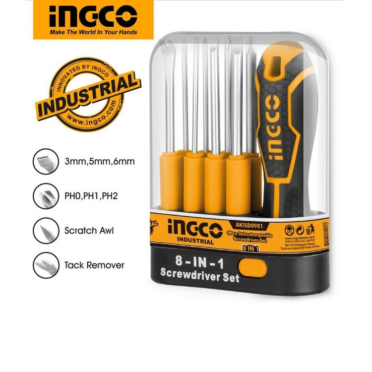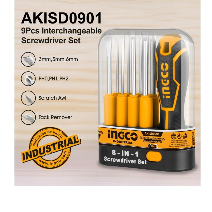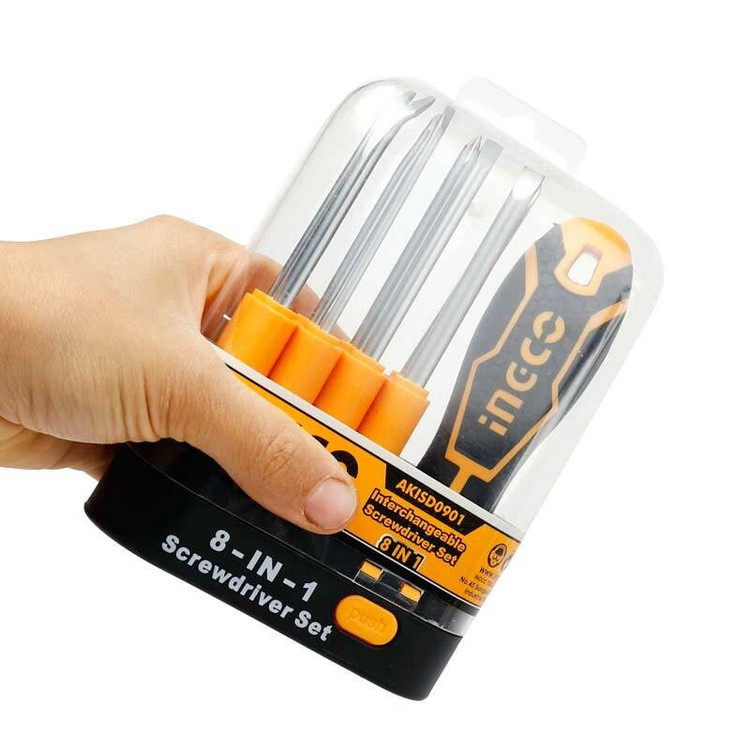 ت 9 عددی پیچ گوشتی اینکو مدل AKISD0901 از سِری پیچ گوشتیهای مجموعهای است که شرکت معتبر اینکو تولید و روانه بازار کرده است. این مدل اینکو که به صورت 9 قطعهای، یا اصطلاحا 8 در 1 است، از 8 سَری پیچ گوشتی متفاوت و یک دسته تشکیل شده است. در واقع این مجموعه قابل تعویض تلقی میشود، به این معنا که همهی سریها به یک دسته متصل میشوند. سَریهای این پیچ گوشتی اینکو عبارتند از سه پیچ گوشتی دوسو، سه پیچ گوشتی چهارسو، یک سری سوزنی و یک خارکش و یا میخ کش. پیچ گوشتیهای دو سو ی این مجموعه در سایزهای 3، 5 و 6 میلیمتر، چهار سو ها در اندازههای PH0، PH1 و PH2، سری سوزنی در سایز 3 و خارکش در اندازه 5 ارائه شده اند. طول همهی سریها 65 میلیمتر و طول دسته 105 میلیمتر است. دسته پلاستیکی این مجموعه، دارای طراحی ارگونومیک با شکل هندسی منظم است و کاربر آن را به راحتی در دست میگیرد و در حین کار خستگیای را متحمل نمیشود. همچنین امکان لغزش یا سر خوردن آن در دستها هم به حداقل میرسد. پک پیچ گوشتی اینکو به گونهای طراحی شده تا سریهای آن به آسانی تعویض شوند بدون اینکه زمان زیادی ببرند و یا برای کاربر مزاحمتی ایجاد کنند. از سوی دیگر این سریها به خوبی درون دسته قرار میگیرند و در طی کار هیچگونه حرکت، لغزش و یا لقیای ندارند. جنس بدنهی پیچ گوشتیها از آلیاژ کروم وانادیوم (Cr-V) ساخته شده که بر روی آنها روکش کروم کشیده شده است. مزیت خوب این مجموعه، آهن ربایی یا مگنت دار بودن پیچ گوشتیهاست. در واقع این خاصیت باعث میشود سری به سطح کار بچسبد، کمتر سر بخود و در نهایت، کار را برای کاربر به مراتب راحت کند. این سری پیچ گوشتی آهن ربایی اینکو سبک است و پیچ گوشتیهای آن بین 68 تا 80 گرم وزن دارند. کل این مجموعه هم در یک محفظه پلاستیکی مقاوم قرار دارد که از مقاومت خوبی برخوردار است؛ ضمن اینکه به یک قفل خودکار و یک آویز نیز مجهز است. این محصول اینکو ساخت کشور چین است و میتوان از آن در کارهای صنعتی و عمومی استفاده کرد