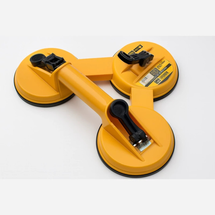 این ابزار سهقلو با طراحی ارگونومیک و بدنهی مقاوم، مناسب برای جابجایی ایمن شیشه، سرامیک، فلز و سطوح صاف و صیقلی است. سه پد لاستیکی با قدرت مکش بالا، توزیع یکنواخت فشار را فراهم میکنند و مانع از لغزش یا آسیب به سطح میشوند. اهرمهای مشکی با طراحی خمیده و سطح آجدار، امکان قفلکردن سریع و مطمئن را فراهم میکنند. بدنهی زرد رنگ از پلاستیک فشرده ساخته شده که هم سبک است و هم در برابر ضربه مقاوم. برچسب مشخصات روی یکی از پدها شامل اطلاعات فنی و بارکد محصول است که شناسایی و ثبت آن را آسان میکند.