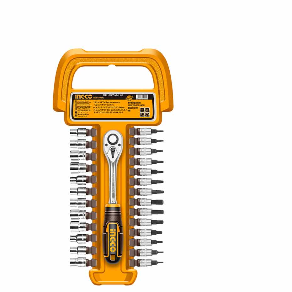 از گرید صنعتی و سوپر اینکو سایز درایو 1/4 اینچ چهارگوش 12 عدد بکس 4 تا 14 میلیمتری 4 عدد بکس آلن H4 تا H7 5 عدد بکس آلن ستارهای T10 تا T30 2 عدد بکس پیچ گوشتی چهارسو PH1 و PH2 3 عدد بکس پیچ گوشتی دوسو SL4، SL5.5 و SL6.5 1 عدد جغجغه 72 دندانه ساخته شده از فولاد کروم وانادیوم روکش کروم ضد زنگ آویز پلاستیکی محکم و با کیفیت مقاوم در برابر خوردگی ساخت چین تحت لیسانس آمریکا