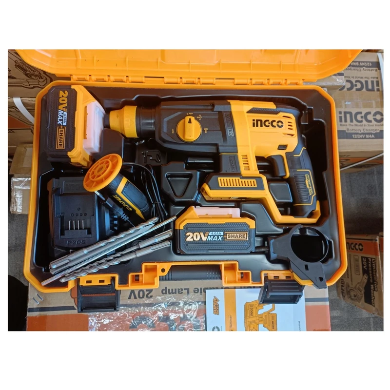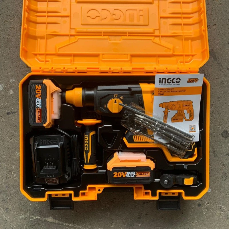 خط کش، دسته جانبی 360 درجه، 3 عدد مته در سایزهای 6 و 8 و 10 میلیمتر، دو عدد قلم تیز و پهن، دو عدد زغال، باطری، شارژر، دفترچه راهنما و کارت گارانتی |