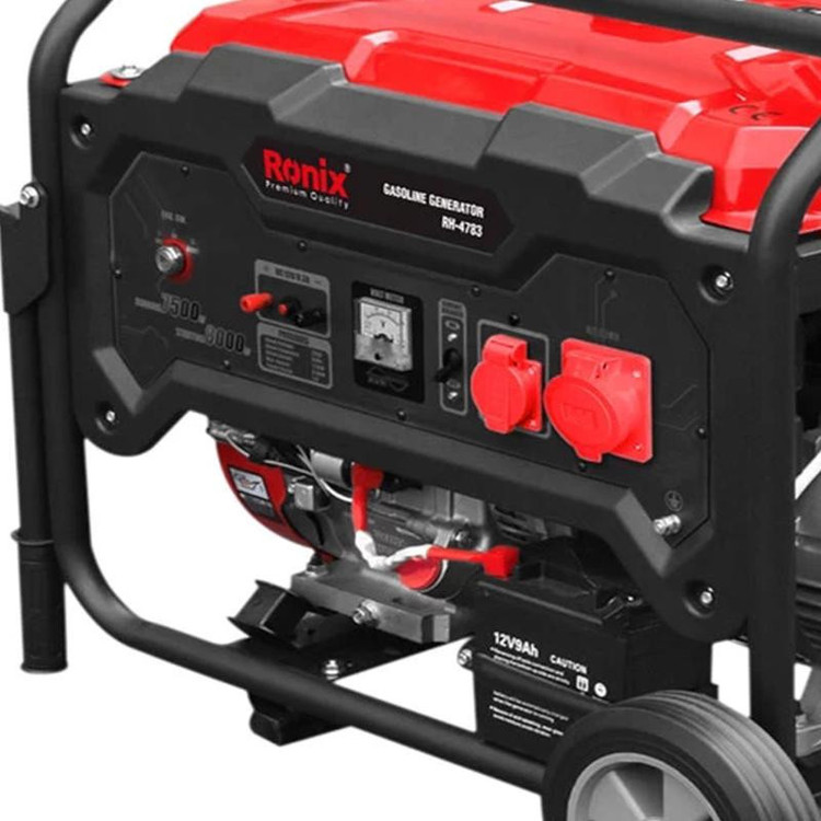 ژنراتور بنزینی 6500 وات RH-4783 رونیکس، با طراحی هوشمندانه و بدنهای کمحجم ساخته شده است تا جابهجایی آن برای افراد آسانتر شود. این دستگاه، برای کاربریهای خانگی، کارگاهی و صنعتی استفاده میشود. همچنین، به موتور تکسیلندر و 4 زمانه با مکانیزم هوا خنک مجهز است که موجب بهبود عملکرد و افزایش طول عمر آن میشود. صدا و لرزش این ژنراتور در حین کار ناچیز بوده و میتوان از آن در فضاهای بسته، به شرط تهویهی مناسب استفاده کرد. موتور تکسیلندر 4 زمانه و دارای سیستم هوا خنک؛ ابعاد برحسب قطر× ارتفاع برابر با 66×90 میلیمتر؛ ظرفیت سیلندر 420 سیسی؛ حداکثر توان خروجی 6.5 کیلو وات (6500 وات) با سرعت 3600 دور بر دقیقه؛ سیستم جرقهزنی T.C.I؛ استارت هندلی و استارتر الکتریکی؛ روغن SAE 10W-30؛ ظرفیت مخزن روغن 1.1 لیتر؛ مدتزمان کارکرد مداوم با حداکثر توان برابر با 7 ساعت؛ نوع شمع F7TC/F7RTC؛ حداکثر نرخ مصرف سوخت 3.57 لیتر بر ساعت است. خروجی دارای ولتاژ 220 ولت AC؛ نرخ جریان 27 آمپر؛ فرکانس 50 هرتز؛ حداکثر توان خروجی 6.5 کیلو وات (6500 وات)؛ نرخ توان خروجی 6 کیلو وات (6000 وات)؛ مجهز به استاتور صد در صد مسی برای حداکثر اثربخشی در مصارف بلندمدت، دارای خروجی 12 ولت DC و 8.3 آمپری؛ ضریب قدرت 1.