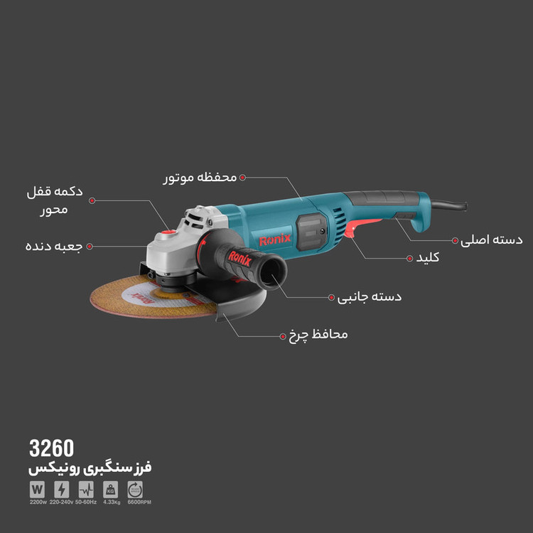 دارای یک موتور قدرتمند حرفهای با توان 2200 وات و عملکرد فوق العاده دارای یک دسته جانبی با امکان نصب در سه حالت، با قابلیت ضدلرزش که خستگی کاربر در حین انجام کارهای طولانی مدت را کاهش میدهد. مجهز به سیستم گردش هوای داخلی به منظور کاهش دمای موتور برای رسیدن به بهترین عملکرد و بالاترین ظرفیت دارای بلبرینگ های ضد غبار که افزایش عمر موتور را تضمین و عملکرد آن را روانتر میکند. طراحی منحصر به فرد در قسمت جاذغالی جهت تعویض سریع و آسان ذغالها مجهز به سیستم قفلکن شفت پیشرفته جهت نصب آسان و ایمن صفحه برش کلید ضدغبار به منظور کاهش نفوذ غبار به ویژه به هنگام کار در پروژههای ساختمانی