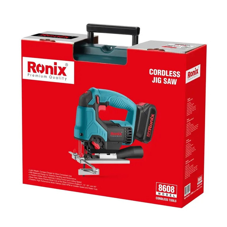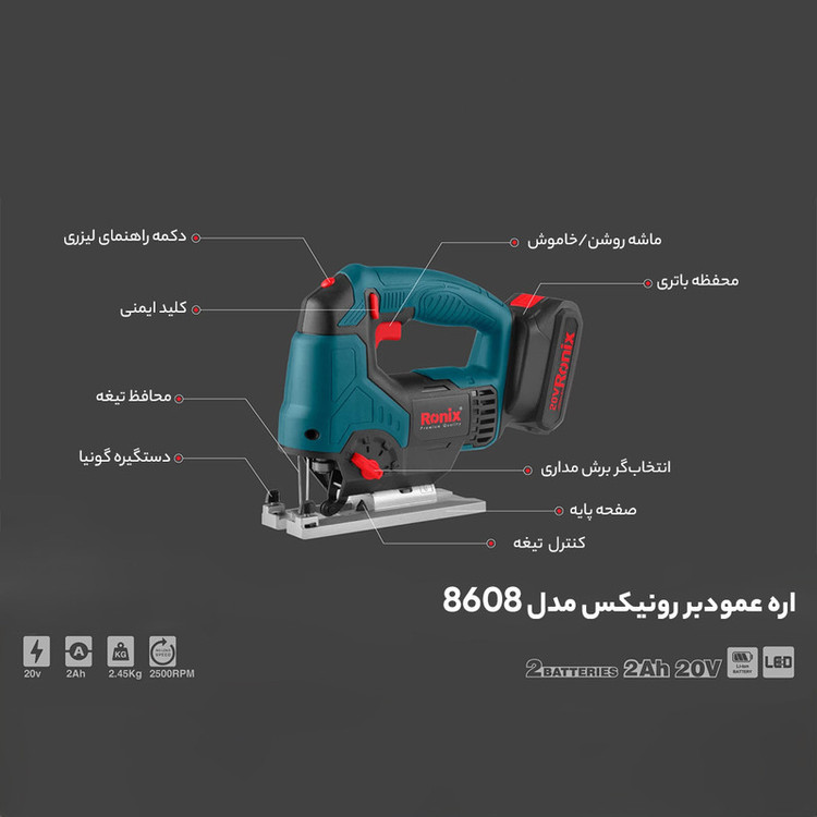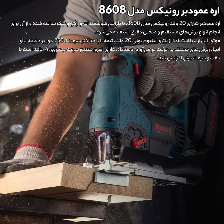 اره عمودبر شارژی 20 ولت رونیکس مدل 8608، با طراحی هوشمندانه و ارگونومیک ساخته شده و از آن برای انجام انواع برشهای مستقیم و منحنی دقیق استفاده میشود. موتور این اره، با استفاده از باتری لیتیوم یونی 20 ولت، تیغه را با حداکثر سرعت 2500 دور بر دقیقه برای انجام برشهای مختلف به حرکت در میآورد. دستگاه، دارای اهرم تنظیم سرعت پیشروی 4 حالته است تا دقت و سرعت برش افزایش یابد. سیستم نگهدارنده تیغه، تعویض سریع و ایمن تیغه را بدون نیاز به آچار برای کاربر امکانپذیر میکند. دستهی لاستیکی نیز مانع از خستگی کاربر میشود. وزن کم و طراحی منحصربهفرد این اره شارژی، کنترلپذیری آن را راحتتر کرده و کیفیت برش را افزایش میدهد.