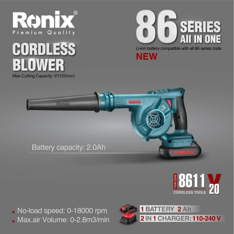 از بلوور یا دمنده و مکنده 8611 رونیکس، برای تمیزکردن سطوح مختلف استفاده میشود. پاکسازی داخل خودرو، حیاط خانه، کارگاههای نجاری، قطعات کامپیوتری و ... از مهمترین کاربردهای مهم این بلوورها هستند. معمولا در این فضاها کاربر دسترسی به برق مستقیم ندارد و استفاده از ابزار شارژی بهترین راه حل برای این مسئله است. بلوور شارژی دوکاره 8611 رونیکس، مجهز به موتور قدرتمند 20 ولتی با جریان مستقیم (DC) بوده و بالاترین توان دمندگی و مکندگی را دارد. همچنین، با سرعتی معادل 18000 دور در دقیقه، جریان هوای 2.8 متر مکعب بر دقیقه را ایجاد میکند. محصول 8611 رونیکس، دستگاهی دوکاره بوده و با دو کاربری بلوور و جاروبرقی قابل استفاده است. علاوهبراین، میتواند 30 دقیقه با حداکثر جریان خروجی روشن بماند و بیوقفه کار کند.