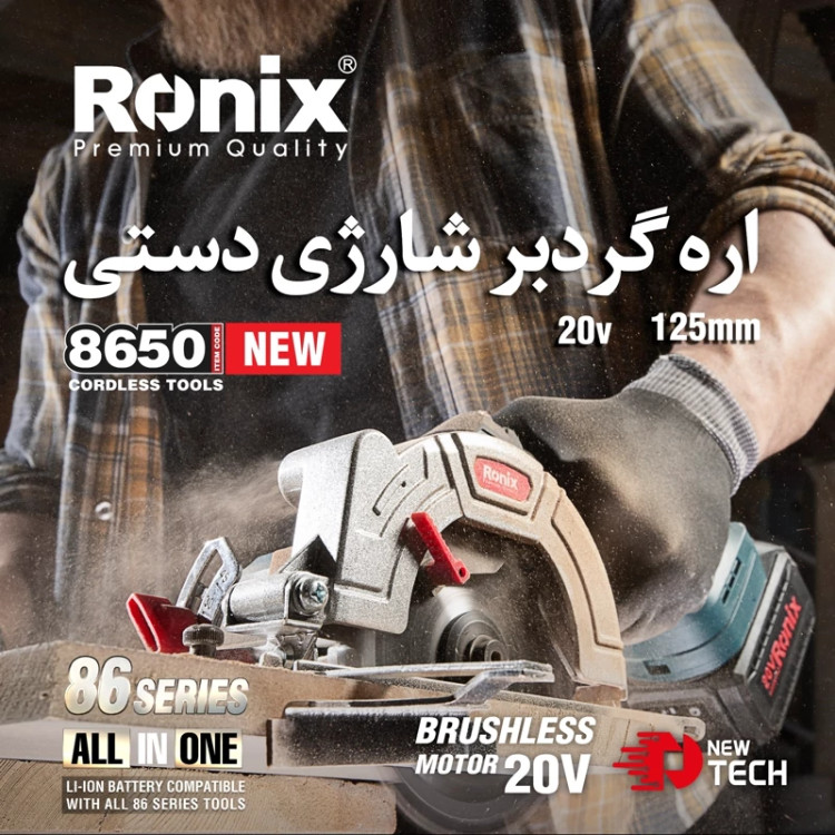 اره گردبر با نام اره دیسکی نیز شناخته میشود و از آن برای ایجاد برشهای مستقیم، اریب، متقاطع و زاویهدار استفاده میشود. ارههای گردبر شارژی، سبک و قابل حمل هستند. نکته مهمتر اینکه برای استفاده نیازی به برق ندارند و همین موضوع، دامنه کاربرد آنها را بیشتر میکند. وجود موتور براشلس در ارههای گردبر شارژی امتیاز مهمی است؛ چراکه در ساختار موتورهای براشلس، از آرمیچرهای آهنربایی دائمی و بردهای الکترونیکی استفاده میشود. در نتیجه، طول عمر این موتورها به طور متوسط 4 برابر نسبت به موتورهای براش افزایش مییابد. اره گردبر شارژی 8650 رونیکس، از یک موتور DC براشلس بهره میبرد. این موتور قدرتمند، با سرعتی بالغ بر 6000 دور در دقیقه، صفحه برش 125 میلیمتری دستگاه را میچرخاند. همچنین، در تمام محصولات سری 86 رونیکس میتوان از باتریهای مخصوص این سری استفاده کرد. مشخصات ویژگیهای اره برقی برش چرخشی قابلیت برش با زاویه قابلیت فارسی بر قفل سوییچ وِیژگیهای تیغه مناسب برای برش امدیاف مناسب برای برش چوب منبع تغذیه باتری ظرفیت برش در چوب 42 میلیمتر سرعت حرکت آزاد 6000 RPM توان 20 وات ابعاد صفحه برش 30x29x5 سانتیمتر اقلام همراه یک عدد آچار آلن یک عدد گونیا یک عدد باتری 4 آمپر ساعت یک عدد شارژر 4 آمپری