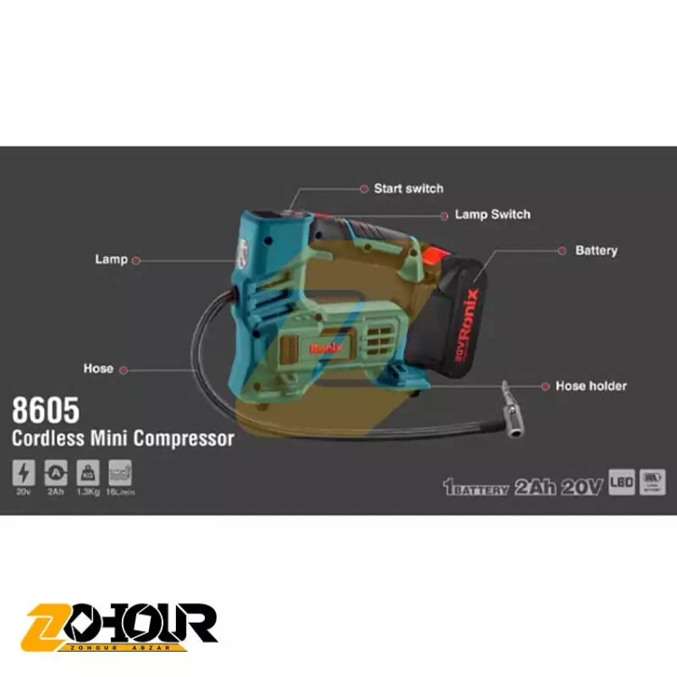 مینی کمپرسور شارژی رونیکس 20 ولت مدل Ronix 8605