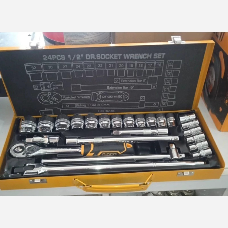 جعبه بکس 24 پارچه دینگی 1/2 مدل DINGQI 14001 ساخت : چین کیفیت در حد محصولات تایوانی جنس : فولاد کروم وانادیوم درایو : 1/2 دارای کیف فلزی قابل حمل تعداد پارچه : 24 پارچه اقلام همراه : شماره بکس :10-11-12-13-14-15-16-17-18-19-20-21-22-23-24-27-30-32 لغلغه درایو 1/2 دسته جغجغه ریز دنده کیفیت بسیار بالا درایو 1/2 رابط 5 اینچی درایو 1/2 رابط 10 اینچی درایو 1/2 دسته کشویی 300 میلی متری درایو 1/2 دسته بکس سر تاشو (لولایی) 180 درجه درایو 1/2