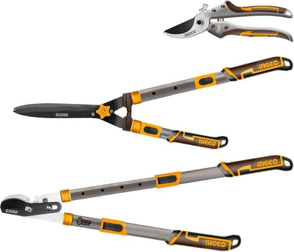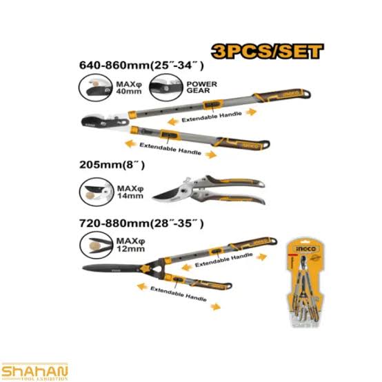 سایز ها: قیچی باغبانی 8 اینچی اینکو مدل HPS0308 قیچی هرس تلسکوپی 30 اینچی اینکو مدل HLTS7608 (قابل تنظیم) قیچی شمشاد زن 860 میلی متری اینکو مدل HHS6306 (قابل تنظیم)