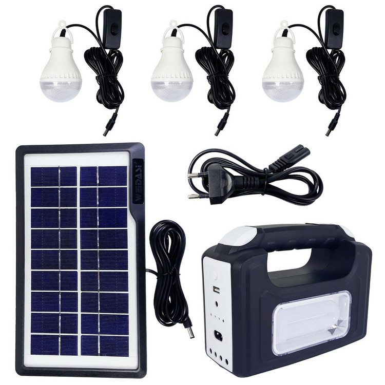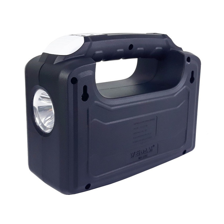 سیستم روشنایی خورشیدی وچراغ اضطراری ویداسی Weidasi مدل WD-1102 مجموعه کاملی برای استفاده در پیک نیک ، کوهنوردی و یا استفاده در باغ و مکانهایی که برق شهر در دسترس نیست می باشد . دستگاه با پنل خورشیدی 3.5 وات 9 ولت با سیم 3 متری که می توان در بیرون منزل یا در بیرون چادر و ..... قرار داد ، قابل شارژ می باشد و همچنین می توان با برق شهر نیز آن را شارژ کرد .این مجموعه دارای 3 لامپ ال ای دی با سیم 3 متری با کلید می باشد که می توان فضای وسیعی را با آنها و بواسطه سیم های بلندشان روشن کرد .علاوه بر آن یک منبع روشنایی بر روی دستگاه اصلی وجود دارد . داخل دستگاه یک عدد باتری 6 ولت 4 آمپر ساعت نوع سیلد اسید قرار دارد . برای شارژ موبایل و تبلت نیز می توانید از کابل رابط چندکاره همراه دستگاه که برای موبایل هاو دستگاههای متفاوت مناسب است با اتصال به قسمت خروجی USB دستگاه ، استفاده کنید.