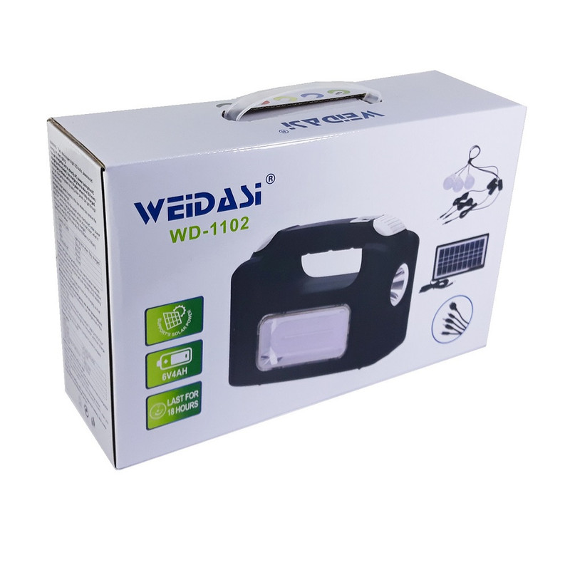 سیستم روشنایی خورشیدی وچراغ اضطراری ویداسی Weidasi مدل WD-1102 مجموعه کاملی برای استفاده در پیک نیک ، کوهنوردی و یا استفاده در باغ و مکانهایی که برق شهر در دسترس نیست می باشد . دستگاه با پنل خورشیدی 3.5 وات 9 ولت با سیم 3 متری که می توان در بیرون منزل یا در بیرون چادر و ..... قرار داد ، قابل شارژ می باشد و همچنین می توان با برق شهر نیز آن را شارژ کرد .این مجموعه دارای 3 لامپ ال ای دی با سیم 3 متری با کلید می باشد که می توان فضای وسیعی را با آنها و بواسطه سیم های بلندشان روشن کرد .علاوه بر آن یک منبع روشنایی بر روی دستگاه اصلی وجود دارد . داخل دستگاه یک عدد باتری 6 ولت 4 آمپر ساعت نوع سیلد اسید قرار دارد . برای شارژ موبایل و تبلت نیز می توانید از کابل رابط چندکاره همراه دستگاه که برای موبایل هاو دستگاههای متفاوت مناسب است با اتصال به قسمت خروجی USB دستگاه ، استفاده کنید.
