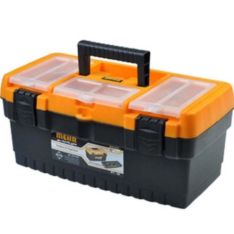 نیاز به داشتن جعبه ابزار در این زمانه بر هیچ کس پوشیده نیست. بدون شک وجود جعبه ابزار در منزل میتواند علاوه راحت شدن دسترسی ما به ابزار های کوچک و بزرگ، حس بسیار دلپذیری که این ابزار ها در کنارهم یکجا جمع شده اند و از خطر گم شدن و خراب شدن دور هستن را برایمان ایجاد می کند. وجود یک جعبه ابزار در خانه و یا اتومبیل از نیاز های واجب زندگی روزمره می باشد. جعبه ابزار برای نگهداری و نظم بخشیدن به ابزار برای حمل و نگهداری آن ها کاربرد دارد.جعبه ابزارها از دو نوع ماده ساخته می شوند یا پلاستیکی هستند یا فلزی. امروزه جعبه ابزارهای پلاستیکی به دلیل سبک تر بودن،پر مصرف تر شده اند.جعبه ابزارهای پلاستیکی،دارای یک سینی ابزار در داخل جعبه نیز هستند.این سینی ها در مدل های متفاوتی در جعبه وجود دارند ، اما غالبا برای نگهداری ابزار کوچک مانند انبردست ، میخ و انواع پیچ گوشتی ها وغیره ، ابزار بلند مانند آچارکاربرد دارند. عبه ابزارهای پلاستیکی وزن کم تری نسبت به جعبه ابزارهای فلزی دارند.جعبه ابزارهای فلزی بدنه آسیب پذیرتری دارند زیرا که امکان آسیب دیدگی (فرورفتگی و یا برآمدگی ) یا ایجاد خط و خش روی آن بسیار زیاد است.خیلی ها معتقدند که جعبه ابزار فلزی استحکام بیش تری دارد. در مجموع جعبه ابزارهای پلاستیکی مزایای بیش تری نسبت به نوع فلزی دارند مانند وزن کم، مقاومت در برابر رطوبت و مواد شیمیایی،عدم زنگ زدگی، مقاومت زیاد در برابر آسیب دیدگی ، تنوع در اندازه و رنگ و طرح و غیره. سایز 16 اینچ-سایز 40*20*20 سانتی متر-دو طبقه-دارای جاقفلی-کیفیت پلاستیک عالی-دارای سه محفظه روی در برای میخ و پیچ- بسیار مناسب برای خانه و ماشین