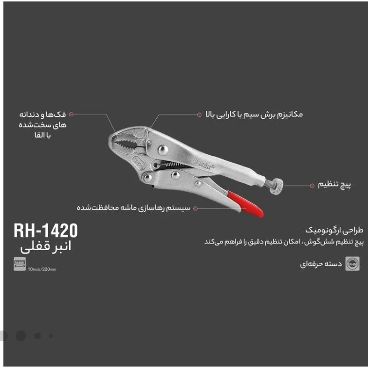 تولید شده از ماده باکیفیت Cr-Mo به منظور ایجاد بالاترین مقاومت در حین انجام کارهای صنعتی - پوشیده شده از نیکل که باعث افزایش طول عمر و ورود آسیب کمتر به ابزار در زمان انجام کارهای دشوار میشود - دارای طراحی ارگونومیک و پیشرفته به منظور استفاده آسانتر - مجهز به فکها و دندانههای سختکاری شده مطابق با استاندارد DIN به منظور افزایش مقاومت سایشی و همچنین ثابت نگه داشتن قطعه کار - مجهز به بولت آلنخور تحتانی به منظور ایجاد فشار و گیرایی بیشتر - دارای قابلیت تنظیم آچار آلن تحتانی به منظور تنظیم فشار بر روی قطعه کار و نزدیک کردن فکها به یکدیگر برای افزایش تسلط بر روند کار - با قابلیت سیمچین برای قطع سیمها و موادی نظیر آن - مجهز به سیستم قفلکن ماشه انبر که قدرت بیشتری را برای ثابت نگه داشتن قطعه کار به کاربر میدهد - با طراحی ارگونومیک به منظور افزایش سهولت روند کار و کاهش خستگی دست کاربر