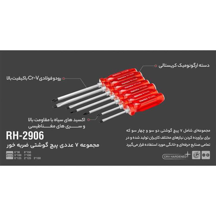 ابعاد پیچ گوشتی های دو سو : 75 × 5 ، 125 × 6 ، 150 × 8 میلی متر ابعاد پیچ گوشتی های چهار سو : 75 × 1 ، 100 × 2 ، 125 × 2 ، 150 × 3 میلی متر قابلیت استفاده از آچار جهت گرداندن پیچ گوشتی