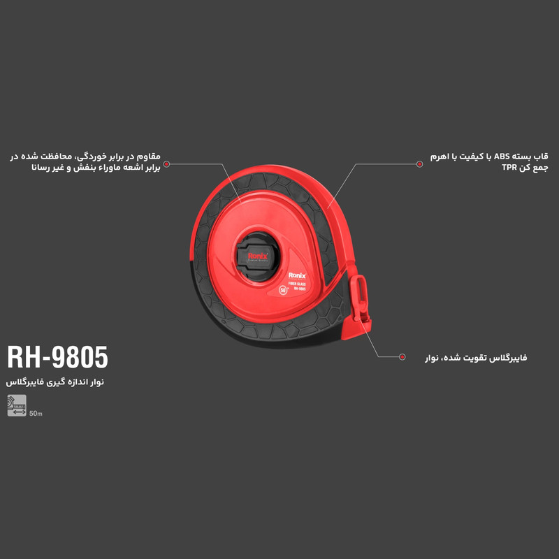 دارای بدنه ضد ضربه و مقاوم - مجهز به حلقه دوار جمع کن جهت سهولت کار و دسته گردان و متعلقات تمام فلزی مقاوم - نوار فایبر گلاس بسیار سبک و مقاوم - روکش مقاوم و بادوام PVC با چاپ دو طرفه
